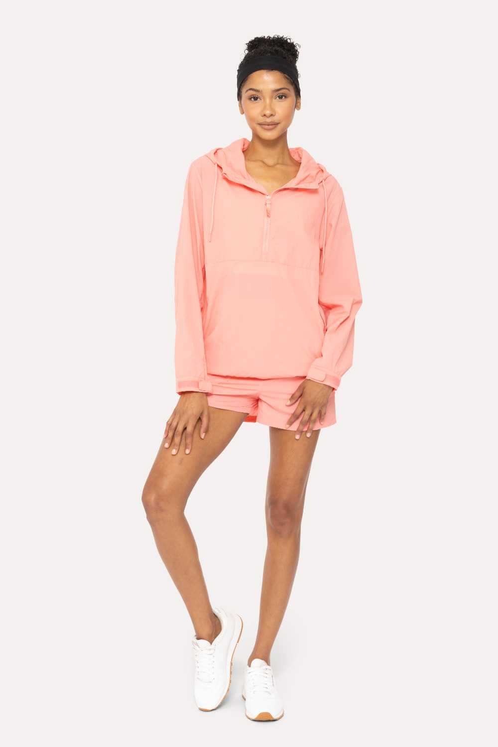 Rain or shine, this lightweight nylon half zip hoodie top features side pockets with zipper closures and adjustable velcro straps on the wristbands. The bungee along the bottom hem allows for a custom fit, while the laser cut panels on the back and under arms provide ventilation.