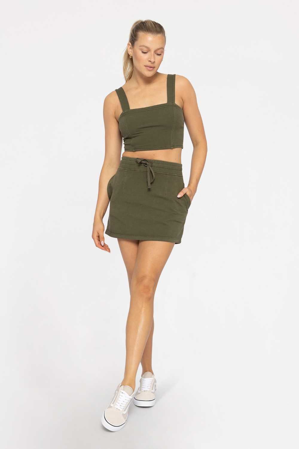 Stay stylishly comfortable in our mini skirt with adjustable waist. Featuring an elastic waistband, drawstring, built-in shorts, and inseam side pockets. Waist darts ensure a perfect fit.